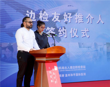 9月17日,溫州機場出入境邊防檢查站舉行“邊檢友好推介人”簽約儀式,溫州和平國際醫(yī)院醫(yī)生豪孟德Hamad Abdul Zahir、蘇瑪Sumayyah Hosany夫婦受邀擔任該站“邊檢友好推介人”,頒發(fā)榮譽聘書,夫婦二人今后將參與到該站外國旅客出入境政策解讀宣講、出入境注意事項指引等工作中。