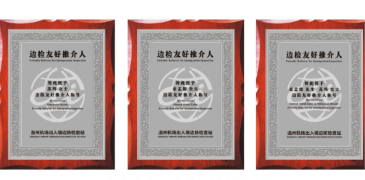 溫州機場出入境邊防檢查站站長劉浩與豪孟德、蘇瑪夫婦簽約,并為他們頒發(fā)榮譽聘書。