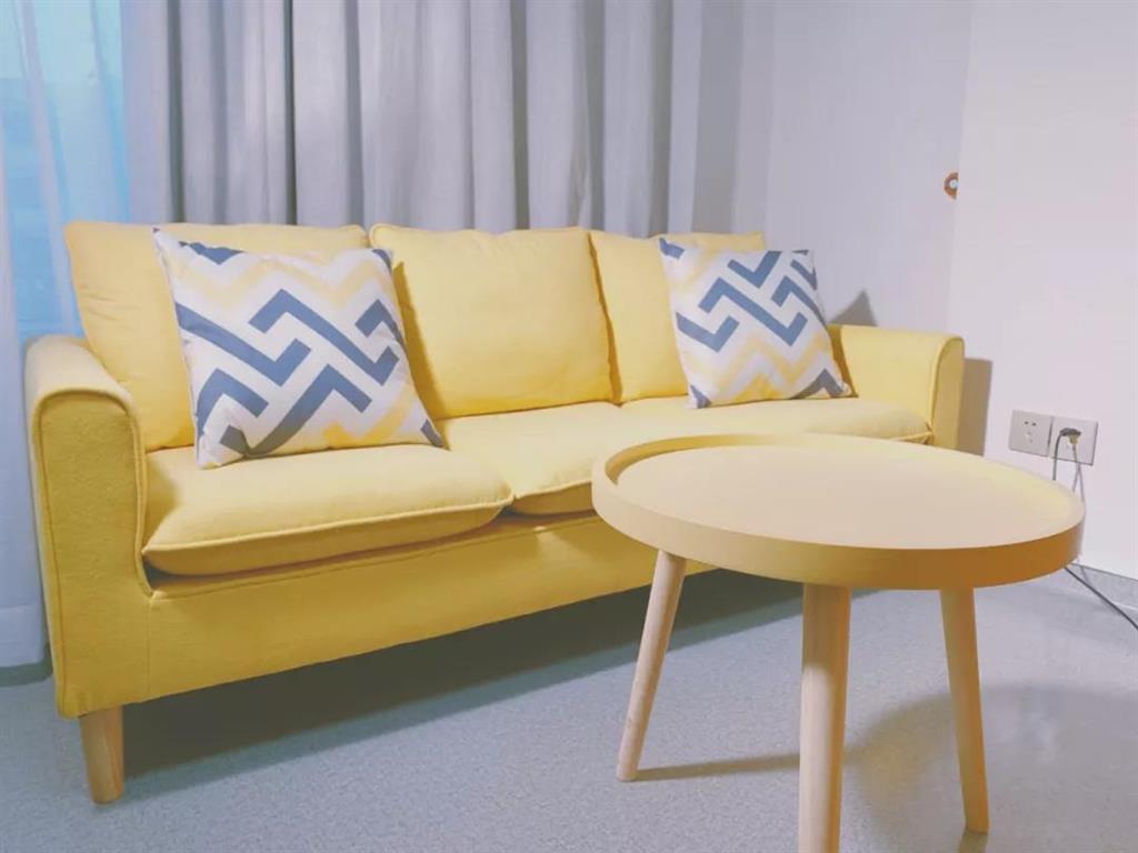 黃色的布藝沙發(fā)和藍色的茶幾讓人心情舒緩