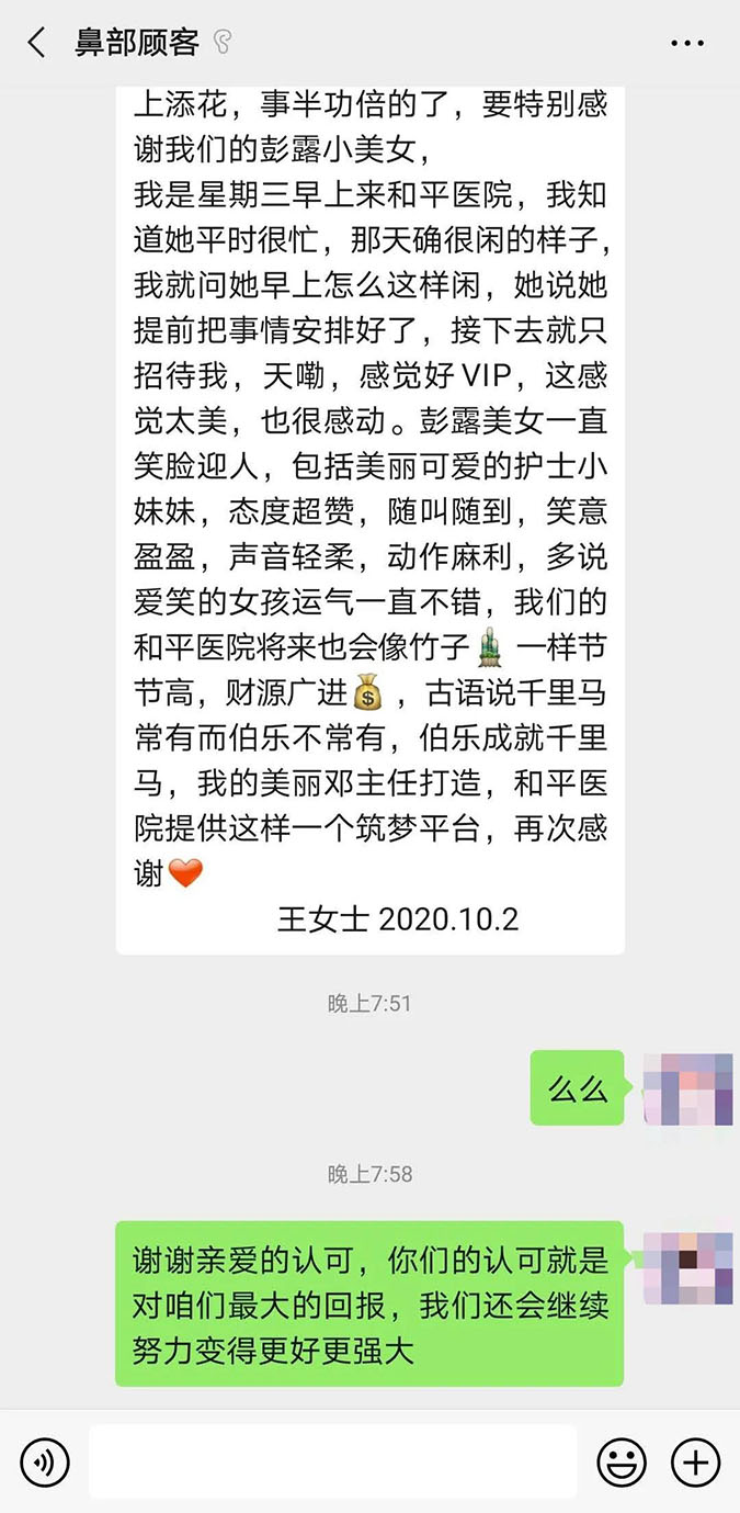特別感謝鄧建平主任,醫(yī)術(shù)精湛,溝通語言有溫度,態(tài)度有柔度,讓我聽了很安心......細節(jié)決定成敗,鄧主任(做鼻子)的細節(jié)處理得恰到好處......每次過來查房,看到他的笑容,我就知道對我鼻子(的手術(shù)效果)他是滿意的。