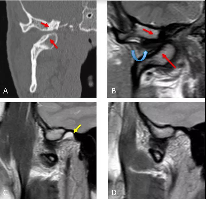 A圖示:閉口位時,顯示下頜骨髁突前上側(cè)面硬化,前方扁平的椎間盤移位(紅色箭頭)。