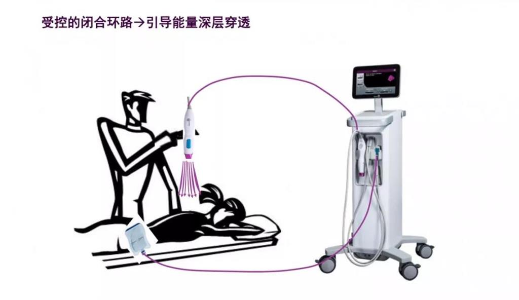 探頭通過皮膚表層傳導(dǎo)能量,穿透深度不僅能達(dá)到真皮層,還可以延伸至纖維間隔,既可以除皺,還能達(dá)到緊致提拉的效果