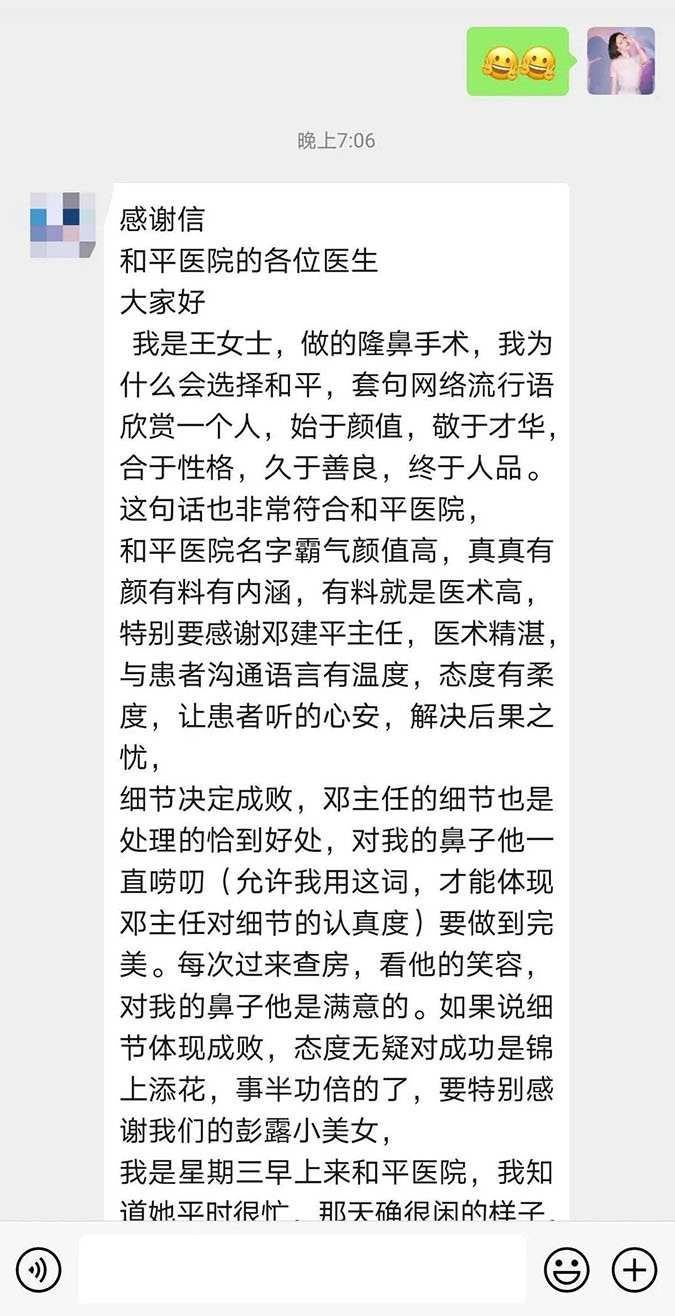 特別感謝鄧建平主任,醫(yī)術(shù)精湛,溝通語言有溫度,態(tài)度有柔度,讓我聽了很安心......細節(jié)決定成敗,鄧主任(做鼻子)的細節(jié)處理得恰到好處......每次過來查房,看到他的笑容,我就知道對我鼻子(的手術(shù)效果)他是滿意的。