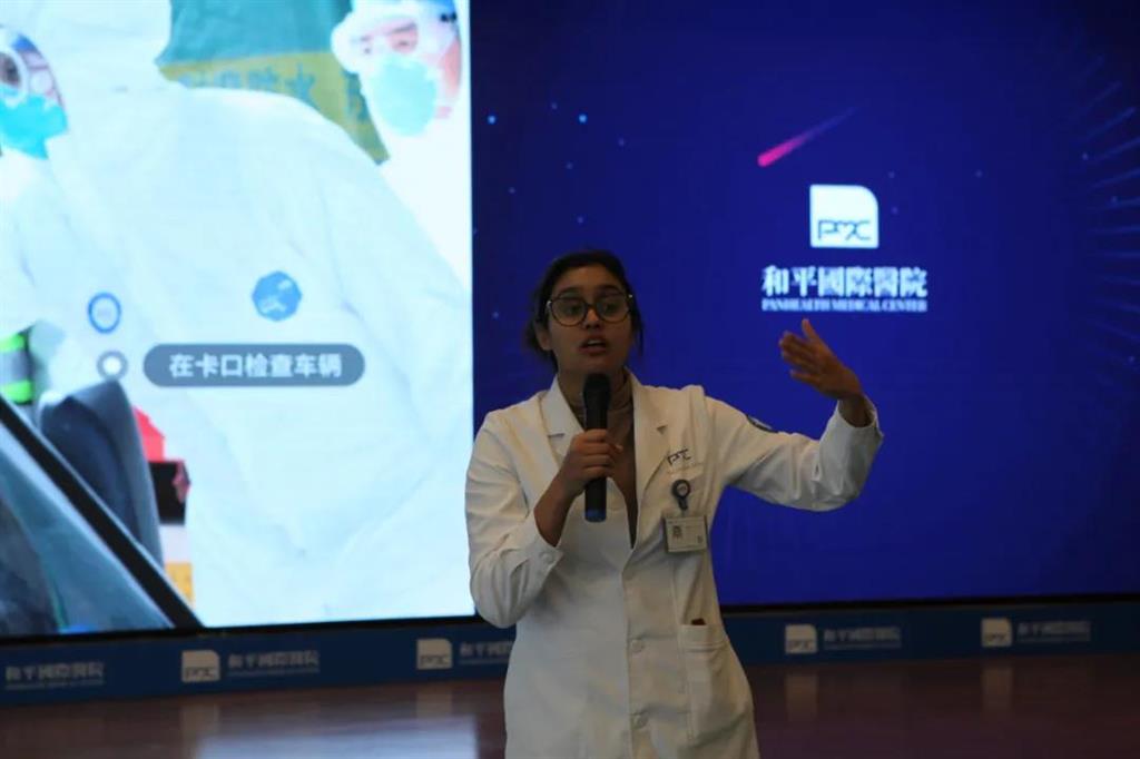 作為溫州最美抗疫人,和平國(guó)際醫(yī)院的跨國(guó)醫(yī)生,來(lái)自毛里求斯的蘇瑪和來(lái)自巴基斯坦的豪孟德分享了他們的抗疫故事。“在疫情期間,家里人讓我回去,但是我拒絕了,我必須留在這里,這是我的使命。”蘇瑪說(shuō)道。同學(xué)們紛紛為她的精神鼓掌。