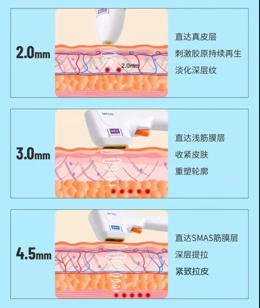 ① 半島超聲炮的治療頭有2.0mm、3.0mm、4.5mm三種深度,可以做到精準(zhǔn)的分層抗衰。并且,治療時(shí)無(wú)痛無(wú)創(chuàng)、安全舒適,治療后效果顯著、無(wú)停工期。② 4.5mm筋膜提拉 直達(dá)SMAS筋膜,懸吊提升下垂皮膚軟組織,提升輪廓;③ 3.0mm緊致,直達(dá)皮下淺筋膜層,緊致皮膚并有選擇性地減少脂肪細(xì)胞,緊致塑形;④ 2.0mm淡紋,直達(dá)真皮層,刺激膠原持續(xù)再生,淡化深層紋。如頸紋、額紋、魚(yú)尾紋等。部分素材來(lái)源網(wǎng)絡(luò)