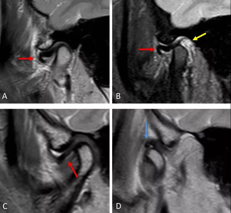 A圖示:閉口位時,顯示下頜骨髁突前上側(cè)面硬化,前方扁平的椎間盤移位(紅色箭頭)。