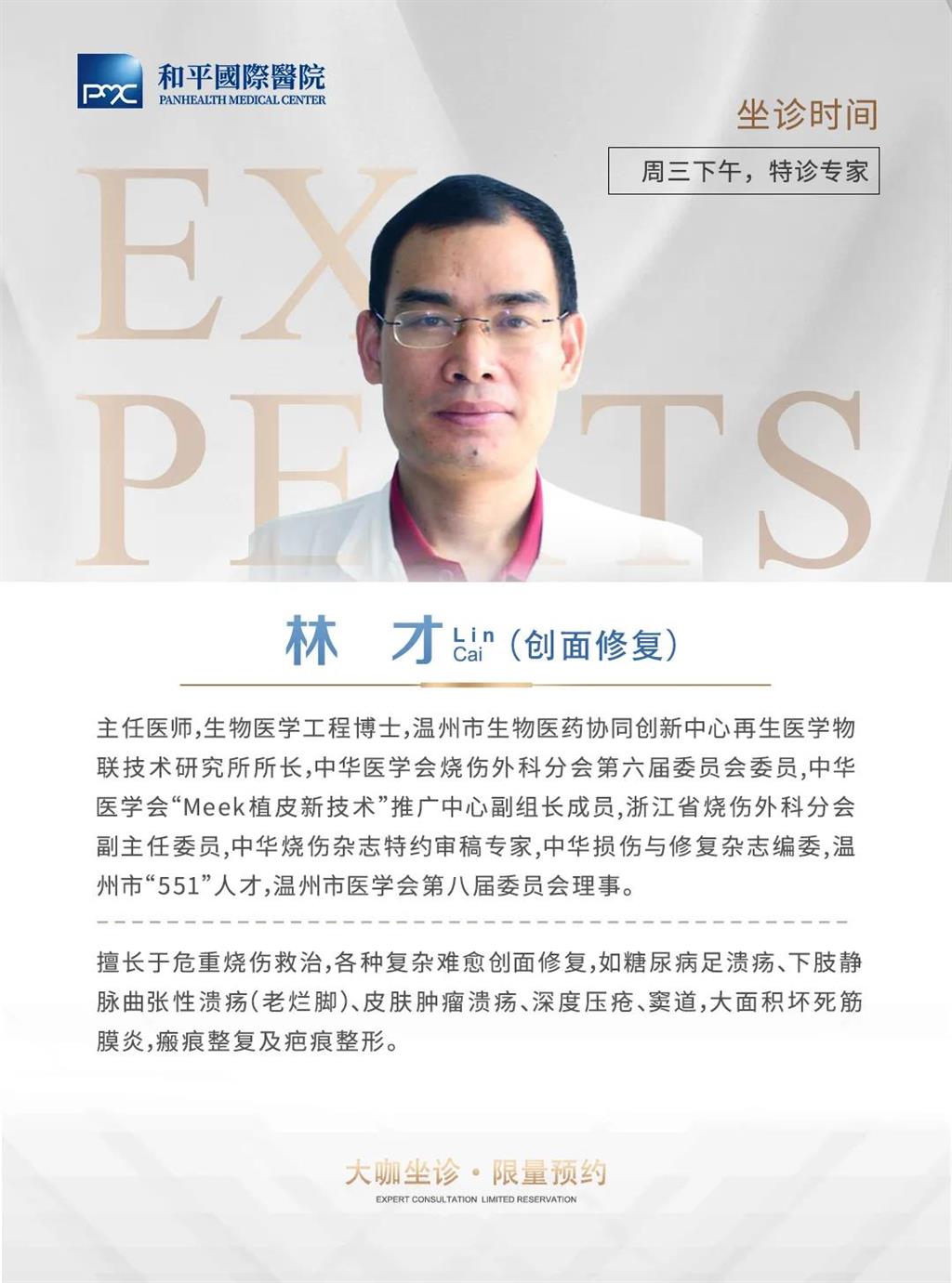 為了使廣大患者享受到更優(yōu)質(zhì)的醫(yī)療服務(wù),滿足患者更高層次的診療需求,和平國際醫(yī)院開設(shè)了名醫(yī)館,特邀創(chuàng)面修復(fù)專家林才主任來院(每周三下午)定期坐診。