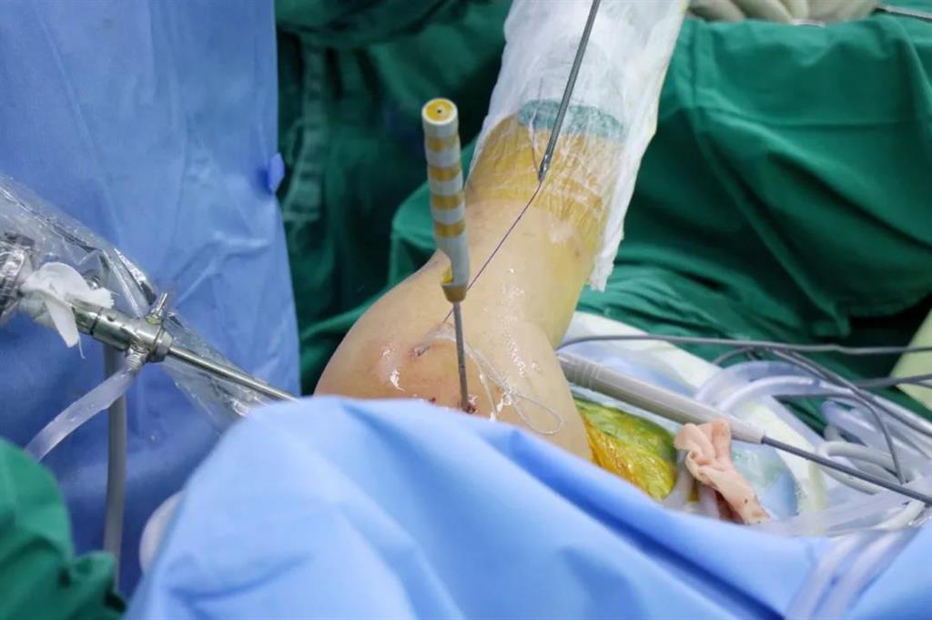 此外,和平國際醫(yī)院關(guān)節(jié)鏡微創(chuàng)團(tuán)隊(duì)還完成了一例交叉韌帶修復(fù)術(shù)。此手術(shù)采用三個約0.5cm的微小創(chuàng)口,于脛骨結(jié)節(jié)處進(jìn)行定位,后鉆通脛骨隧道,應(yīng)用多種袢鈦板進(jìn)行多位置固定,手術(shù)過程短,創(chuàng)口小,術(shù)后效果好,患者十分滿意。