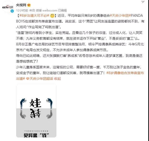 內(nèi)容對(duì)平均年齡只有8歲的偶像組合,#天府少年團(tuán)#PANDA BOYS(后更名為“熊貓少兒藝術(shù)團(tuán) Panda Boys”)出道一事進(jìn)行點(diǎn)名批評(píng)。一句“別讓金色的童年,變成金子的童年”發(fā)人深省,在娛樂亂象頻出的當(dāng)代,“偶像”低齡化內(nèi)卷問題越來越嚴(yán)重,錯(cuò)誤的價(jià)值觀誤導(dǎo)著一批又一批辨別能力較弱的青少年。“偶像”不應(yīng)該成為一種盈利、創(chuàng)收的手段,它應(yīng)該代表的是一種“精神”,是正向價(jià)值觀的體現(xiàn),是能夠鼓舞人心,不斷提升自己的榜樣。
